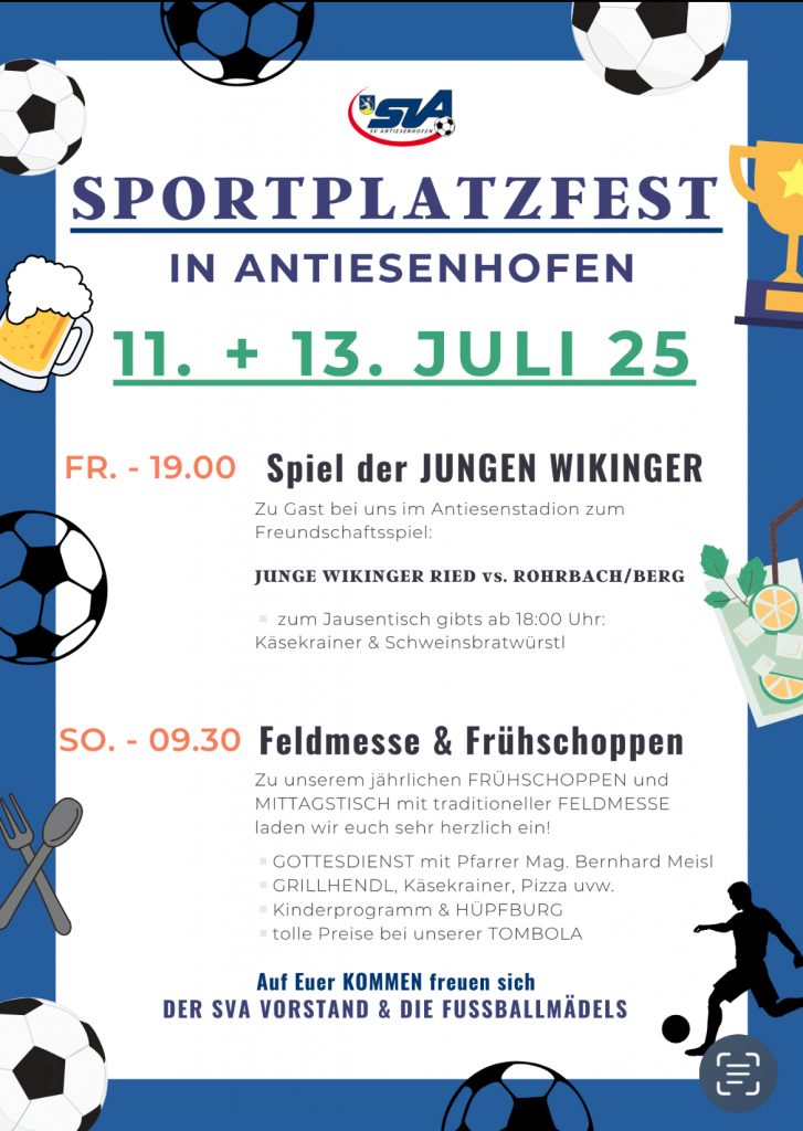 Wir laden euch ALLE recht herzlich ein zu unserem diesjährigen Sommerfest am Sportplatz in Antiesenhofen. 🎉🥳